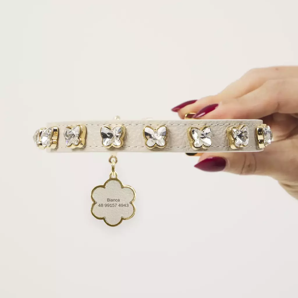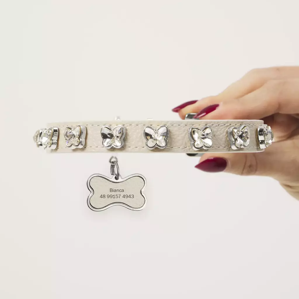 Cada detalle ha sido diseñado pensando en el bienestar de tu mascota: el collar está acabado con pintura italiana de alta calidad para bordes, lo que garantiza un efecto engomado y un acabado impecable. Las piedras de cristal en forma de mariposa añaden un toque de sofisticación y brillo, convirtiendo el collar Aura en un auténtico accesorio de moda para tu mascota.