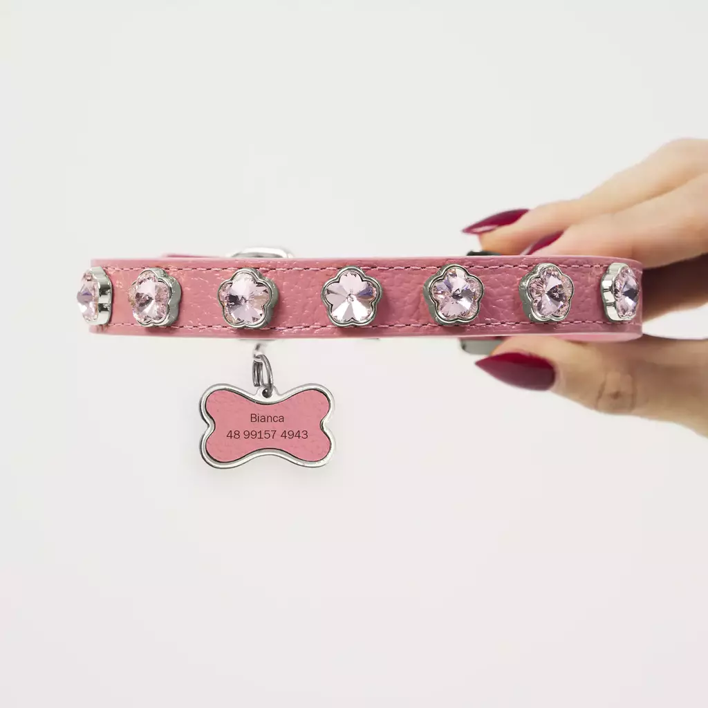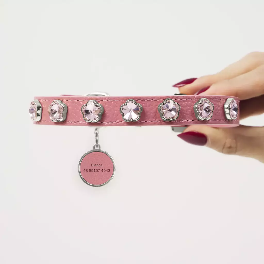 Every detail has been designed with your pet's well-being in mind: the collar is finished with high-quality Italian edge paint, ensuring a rubberized effect and impeccable finish. Flower-shaped glass stones add a touch of sophistication and shine, making the Elyse collar a true fashion accessory for your pet.