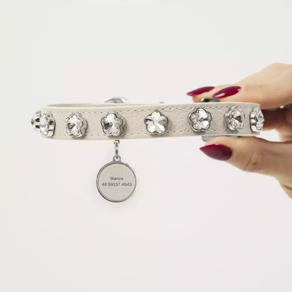 Elyse - Personalized Leather Collar - Off White with Crystal Stones